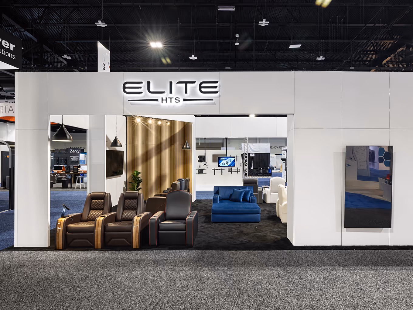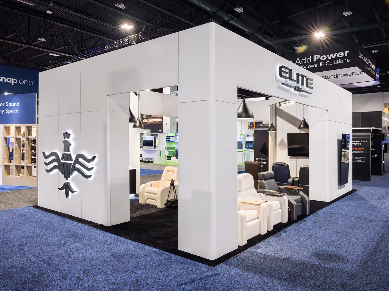 Elite required a high-end modular trade show exhibit that could create an immersive setting for their luxury home theatre seating line. Designed to be scale for 20x20 and 20x30 island booth footprints, the exhibit balances an open, inviting layout with corner enclosures. These areas support wall-mounted monitors, meeting space, and experiential lounge zones for product demos.