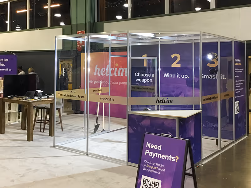 Our first collaboration with Helcim was a fully enclosed "Smash Room" built for the Small Business Week Expo in Calgary. We produced a modular booth with large-format graphics; the enclosed room lets you take a swing at old payment terminals for a memorable brand moment.